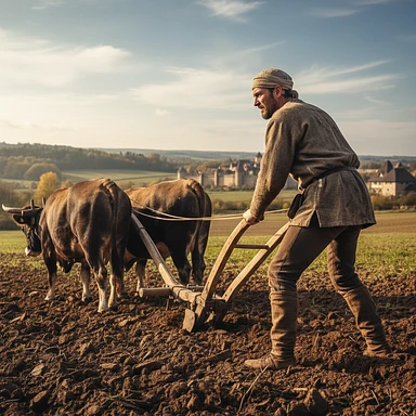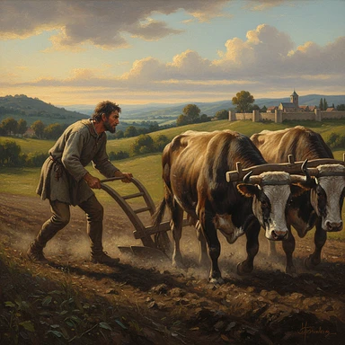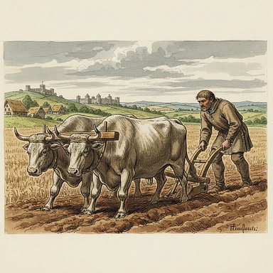 нарисуй строго в профиль средневекового мужчину с плугом и волами без фона emoji