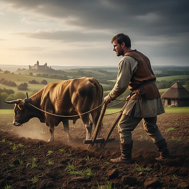 нарисуй в профиль средневекового мужчину с плугом и волами emoji