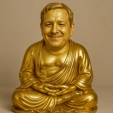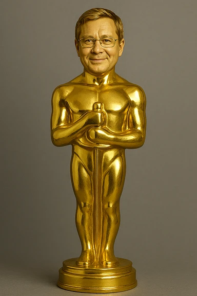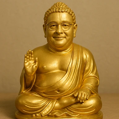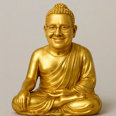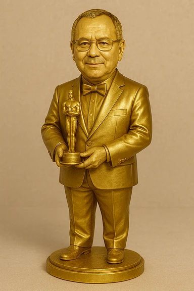 Сгенерируй мне такую же сувенирную статуэтку, только с лицом человека которого я прикрепил. Статуэтка должна быть полностью из такого же золота image | AI Emoji Generator