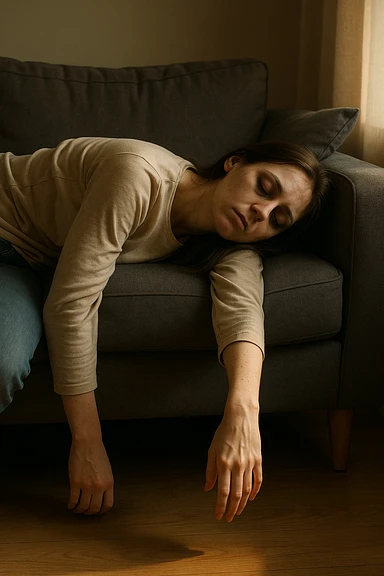 Empathetic photorealistic shot of a woman collapsed on a sofa, her body completely limp as if made of lead. One arm hangs off the edge, touching the floor. Her eyes are closed, face pale with dark circles. The afternoon light is warm but fails to energize the scene, emphasizing her profound exhaustion. emoji
