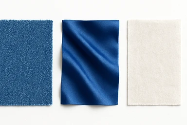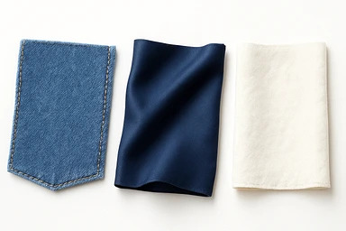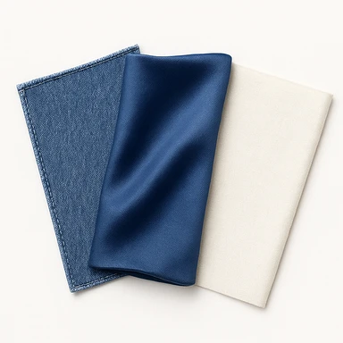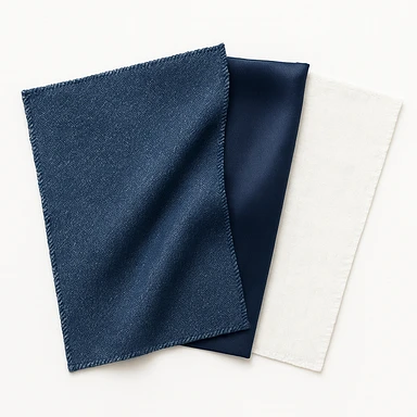 Сгенерируй мне аккуратный, но не квадратный, кусок джинсовой ткани, на чисто белом фоне. И чтобы было три разных ткани, допусти одна джинсовая, вторая шелк, третия хлопок. И они рядом с друг другом, как карты, веером emoji