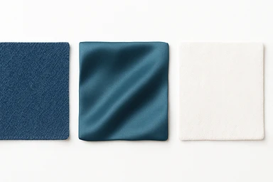 Сгенерируй мне аккуратный, но не квадратный, кусок джинсовой ткани, на чисто белом фоне. И чтобы было три разных ткани, допусти одна джинсовая, вторая шелк, третия хлопок. emoji