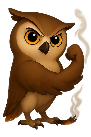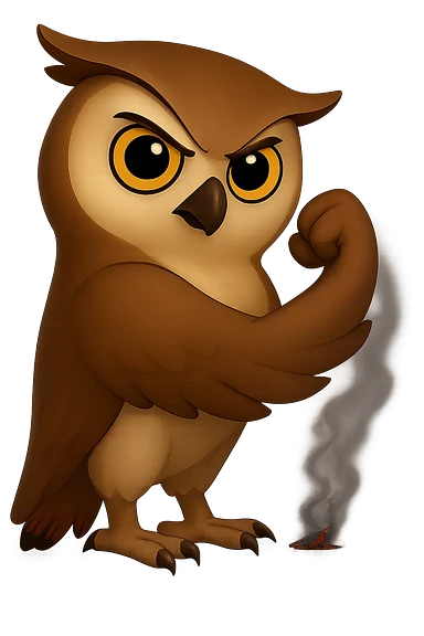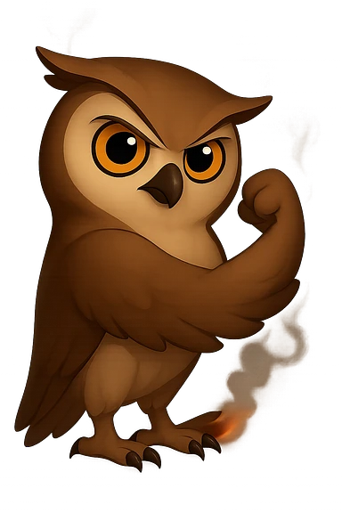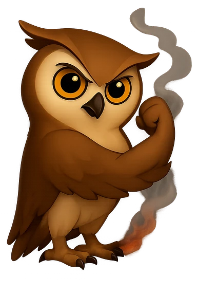 Точно такая же картинка и поза, только хвост совы слегка подгоревший и от него идет дымок, прозрачный фон emoji