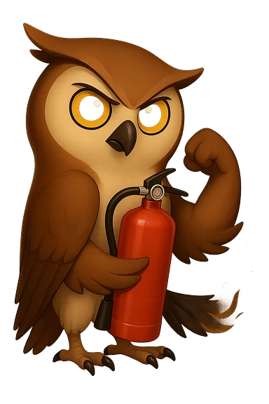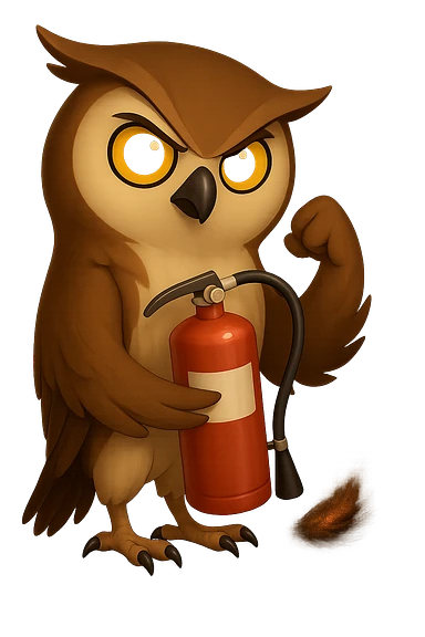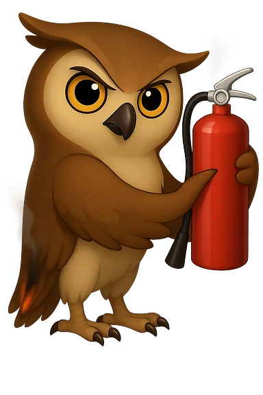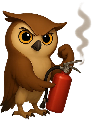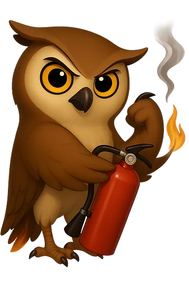 Точно такая же картинка и поза, только в другом крыле сова держит огнетушитель, хвост совы слегка подгорел и от него идет дымок, прозрачный фон emoji