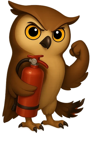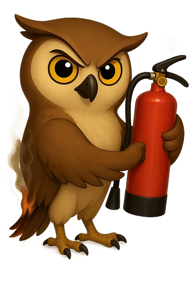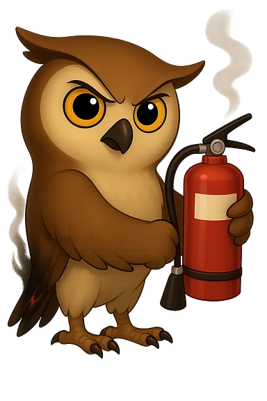 Точно такая же картинка и поза, только в другом крыле сова держит огнетушитель, хвост совы слегка подгорел и от него идет дымок, прозрачный emoji