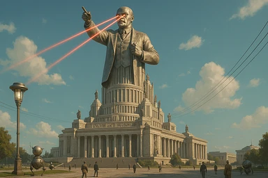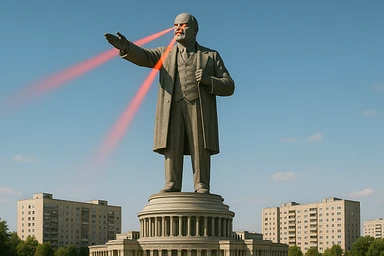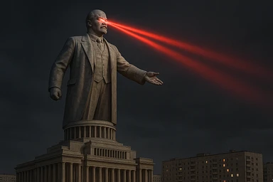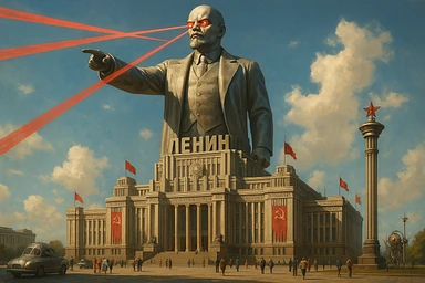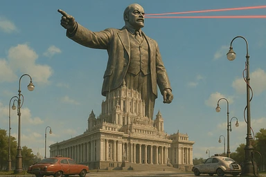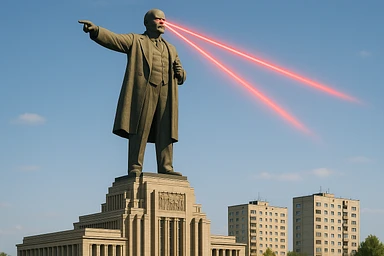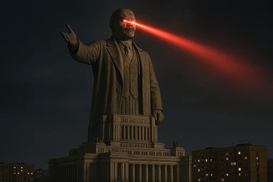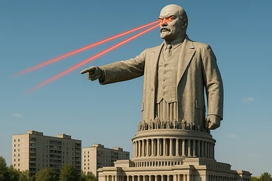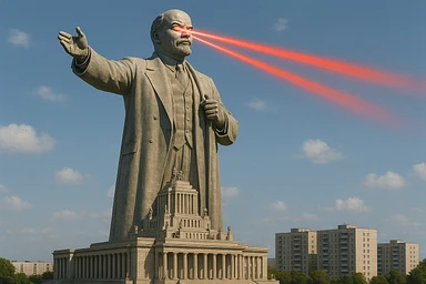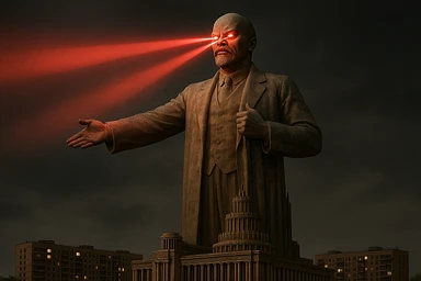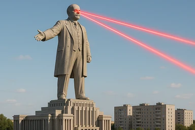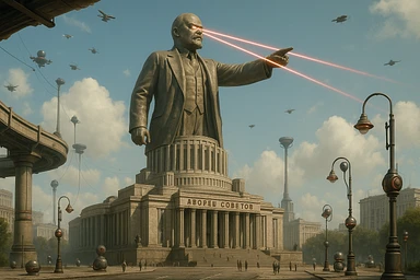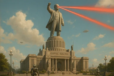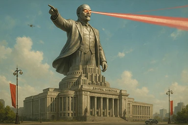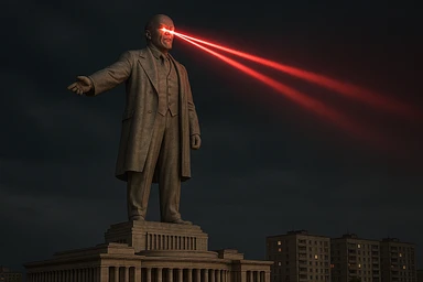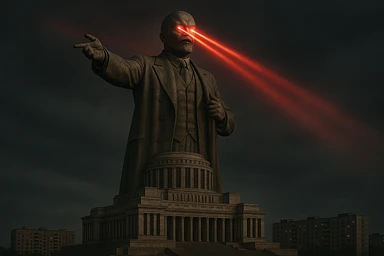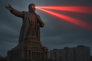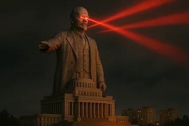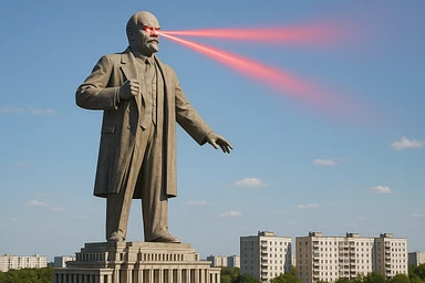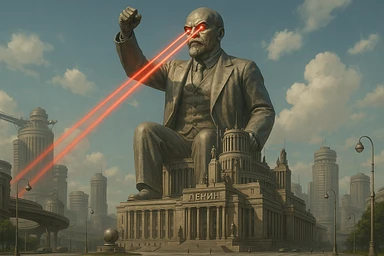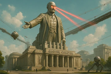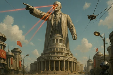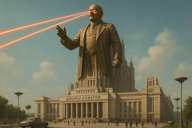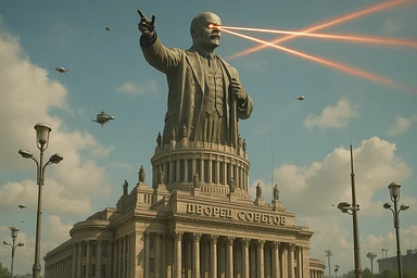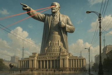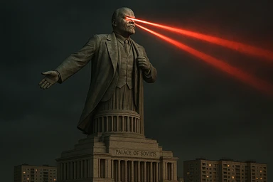 Дворец Советов, основной упор на 100-метровую фигуру Ленина, у которой из глаз вылетают 2 луча прожектора красного цвета.