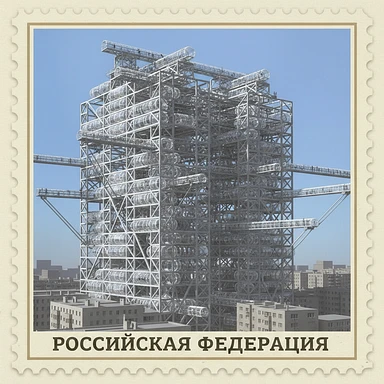 Замени изображение внутри марки на капсульный дом-коммуну конструктивизм 1920-е годы, из произведения "Мы" замятина emoji