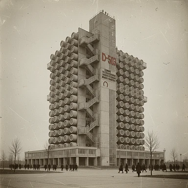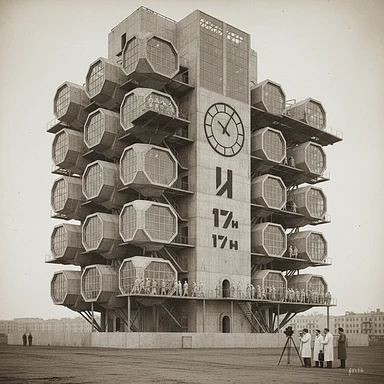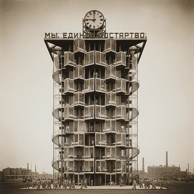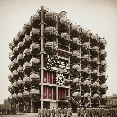 капсульный дом-коммуну конструктивизм 1920-е годы из произведения "Мы" Замятина стилизуй под марку как на фото image | AI Emoji Generator