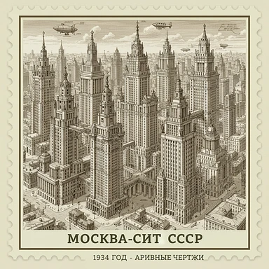Москва-Сити, если бы его построили в СССР в 1934 году. Архивные чертежи Стилизуй изображение под марку как на фото emoji
