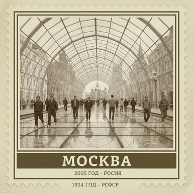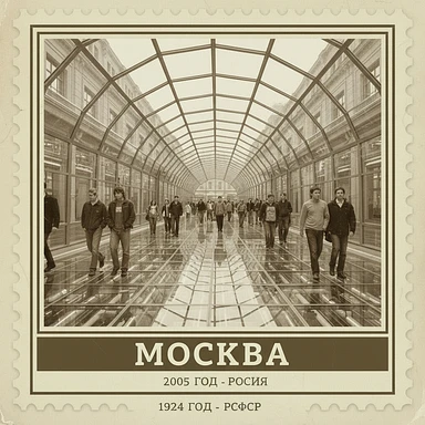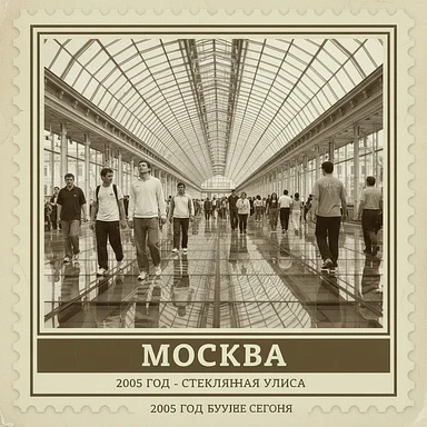 Полностью стеклянная улица в Москве (сверху также накрыта стеклянными арками), по которой гуляют люди, машин нет. 2005 год. Стиль - фотореализм. Стилизуй под марку с фото emoji