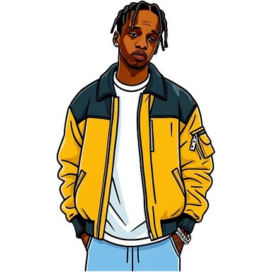 2019 Travis Scott celebrity and rapper, hperrealistic, mirco-detailed, vivid, bold colo=s, 3D sticker design Must be 8k hd, 8000x8000px resolution. Must use very thin transparent smooth lines emoji