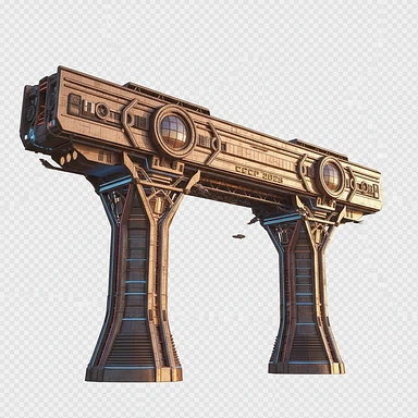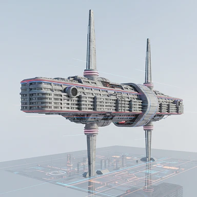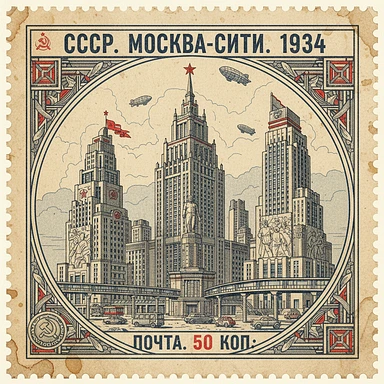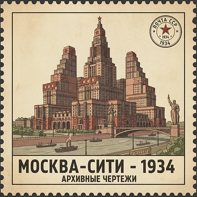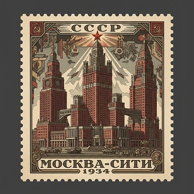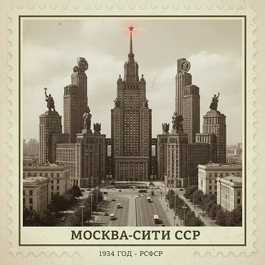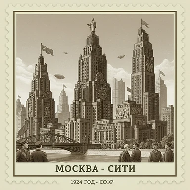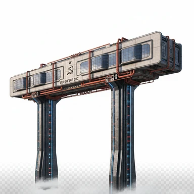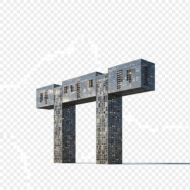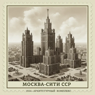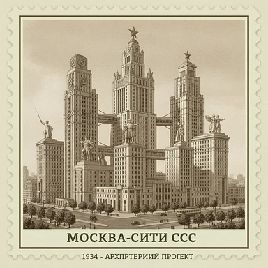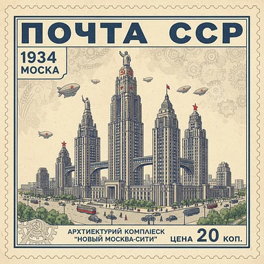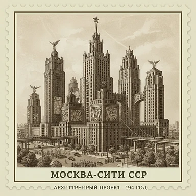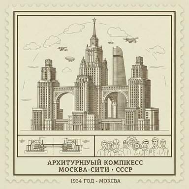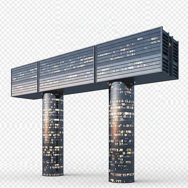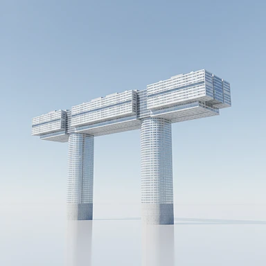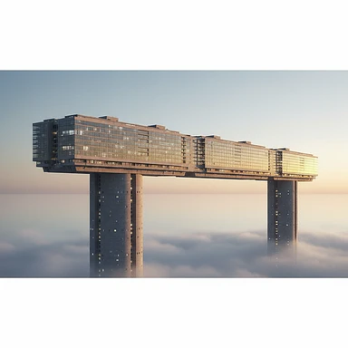 Удлиненная панелька в стиле, если бы ее строили в позднем СССР в 2025 году. Стоит на двух высоких небоскребах, которые как опоры держат ее на себе.