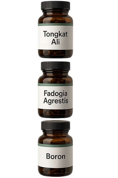 4 boccette di integratore: Tongkat Ali, Fadogia Agrestis, Boron e Zinco fluttuano in aria verticalmente emoji