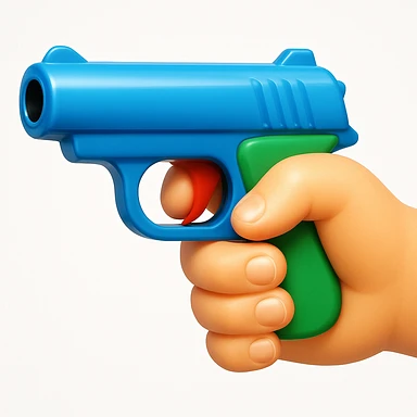 A 3D iOS emoji-style close-up of an index finger pulling a pistol's trigger, showing only the hand and the trigger area inside the trigger guard; stylized, non-realistic toy-pistol look, glossy Apple-style finish, clean white background.