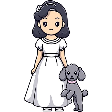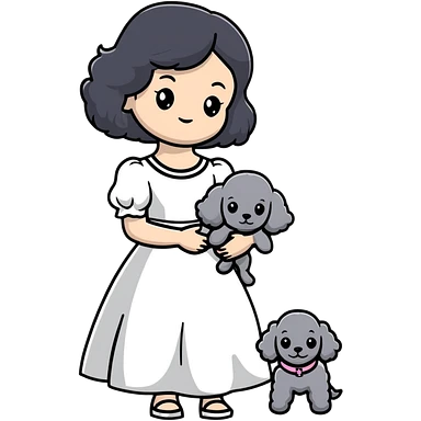 beautiful girl with long black hair in a white dress holding a small gray poodle emoji