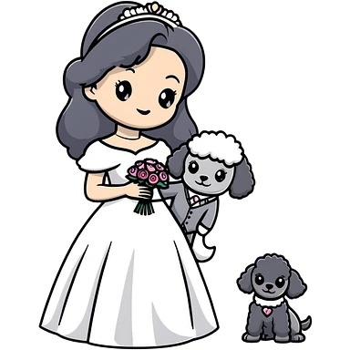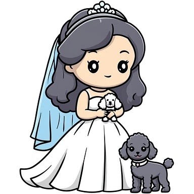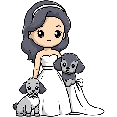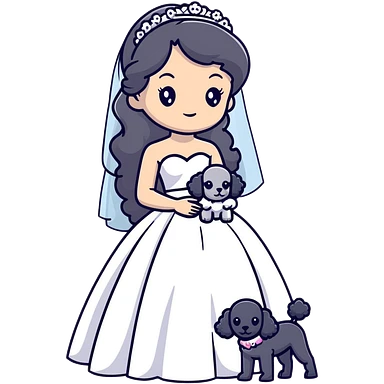 A beautiful girl with long black hair in a wedding dress holds a small gray poodle emoji