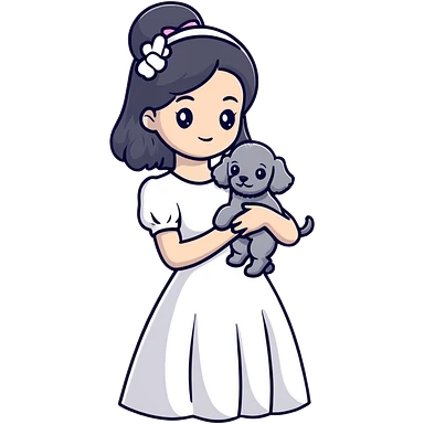 A beautiful girl with long black hair in a white dress holds a small brown curly-haired dog image | AI Emoji Generator