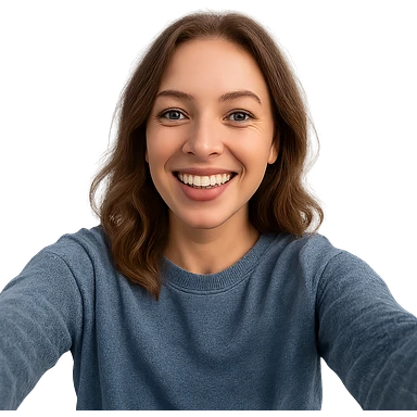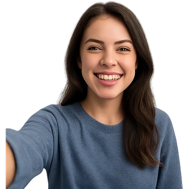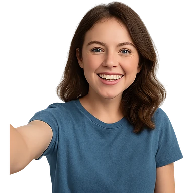 A group selfie of a family of four in front of a house: dad is bald with medium light skin, mom and older daughter have curly hair and pale skin, younger daughter has straight hair and medium light skin. The older daughter holds the phone, sisters look amused, parents smile.image