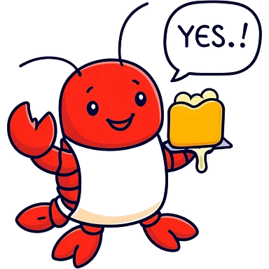 A smiling red lobster with a food bib, holding a Twinkie that has cream coming out of it with the Twinkies bubble word caption saying yes, squeeze me emoji