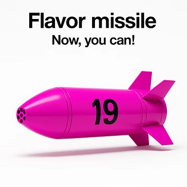 a product image - white background - a orthographic side view of a sleek, minimalist futuristic sidewinder missile pod which is colored 255-0-255 pink, with a black number "19" emblazoned on the sign. The product image reads "Flavor missile - Now, you can!" image