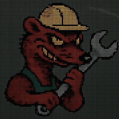 AN ANTHROPOMORPHIC WEASEL WITH A HARDHAT AND A LARGE SPANNER WRENCH - AIRPLANE FUSELAGE nose art 1940s era - he has a very VERY dark and mischevious look in his eye- grinning - digital scanner projection, virtual digital RETRO DOS ASCII ARTimage