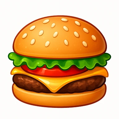 A classic single patty hamburger emoji,, glossy and colorful. Soft rounded bun with sesame seeds, one beef patty, fresh lettuce, ONE tomato slice, melted cheese, realistic but cartoonish look, clean white background emoji
