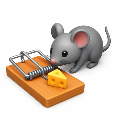 A 3D emoji in iOS emoji aesthetic style of a small mousetrap on a wooden base with a tiny gray mouse approaching a small piece of yellow cheese on it, minimal white background, bright lighting, clean and glossy Apple-style design emoji