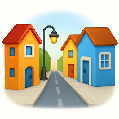 emoji of a small cozy street scene — a narrow road with a sidewalk, a few colorful buildings on the sides, and a streetlight. Soft daylight, clean design, minimal background, cheerful and detailed Apple emoji style emoji