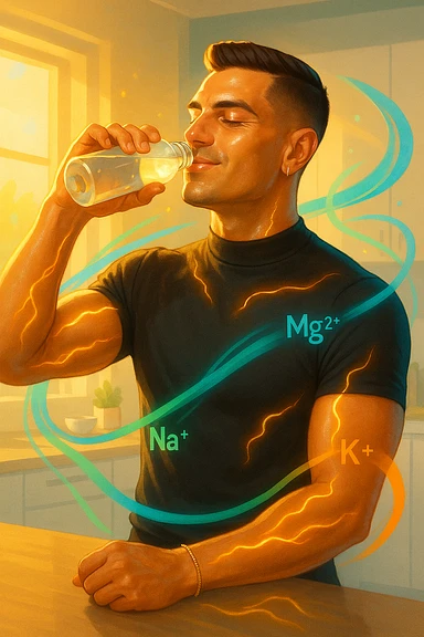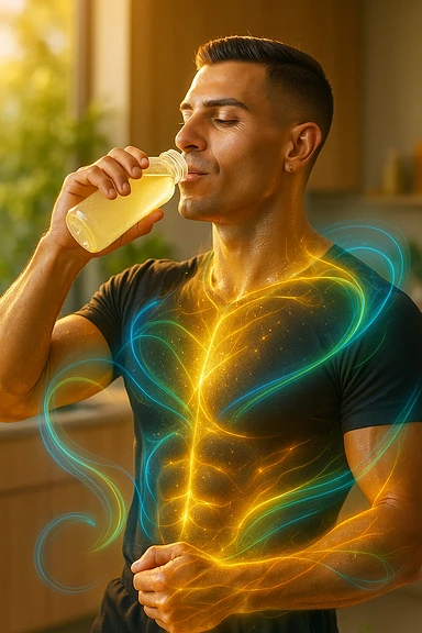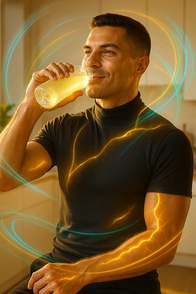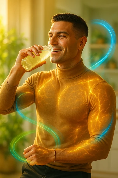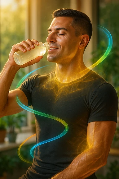 Athletic man around 30 years old, early morning, drinking a transparent electrolyte-rich beverage from a bottle. Body illuminated by natural golden light, with a light energetic aura around muscles symbolizing regeneration and recovery. Relaxed and vital expression, hydrated and glowing skin. Around him, light and colorful flows (blue, green, orange) represent electrolyte balance: sodium, potassium, magnesium. Natural environment or modern minimalist kitchen. Positive, clean, and invigorating atmosphere. Vertical 9:16 format. Inspired by the face in the reference photo. emoji
