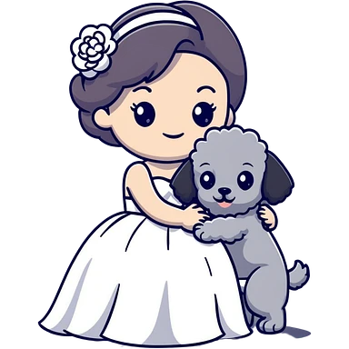 beautiful girl in a wedding dress hugging a small gray poodle emoji