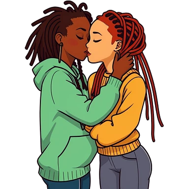 A black girl with dreads kissing a medium skin toned girl with dark red hair emoji