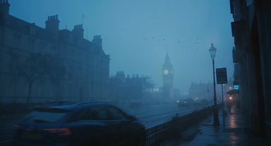 Cinematic shot of a london street, cloudy foggy day, soft light, car flying, leading lines to big ben in distance, multi composition, in foreground blurred car, on second street around UK bulding, od another plan in distance big ben, birds flying, artistic look, captured on arri alexa 35, blue hour emoji