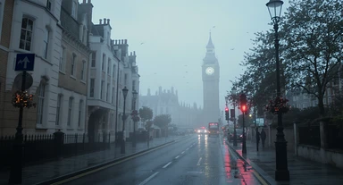 Cinematic shot of a london street, cloudy foggy day, soft light, leading lines to big ben in distance, multi composition, in foreground blurred car, on second street around UK bulding, od another plan in distance big ben, birds flying, artistic look, captured on arri alexa 35, triadal compositionimage