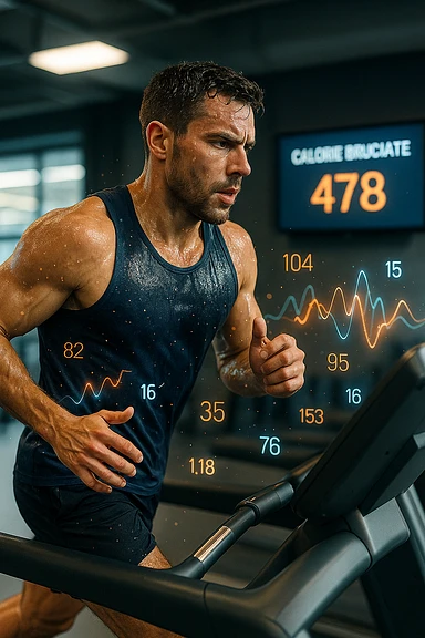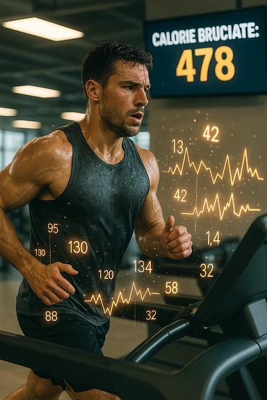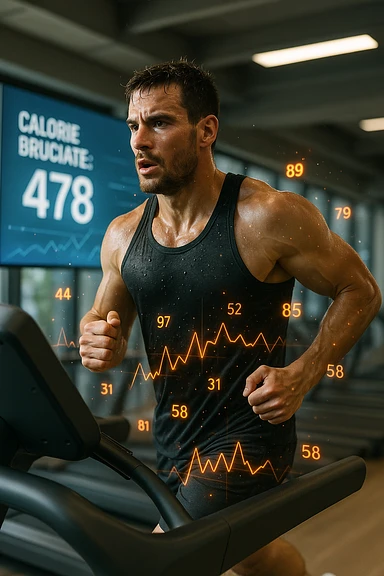 Uomo atletico su tapis roulant in palestra, visibilmente sudato, in piena corsa. Sullo sfondo uno schermo digitale che mostra 'Calorie bruciate: 478'. Intorno al corpo dell’uomo si vedono numeri fluttuanti e grafici energetici, come se si stessero misurando in tempo reale le calorie consumate. Atmosfera dinamica, luce intensa da palestra, sensazione di movimento e impegno. IN ITALIANO emoji
