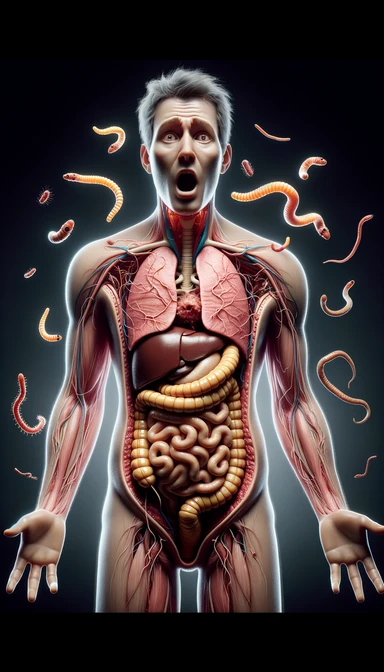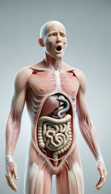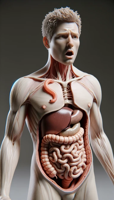 corpo umano anatomico con intestino in evidenza, con parassiti tipo la tenia che gli striscia addosso, sulla pelle, figura visibile fino ai fianchi, espressione del volto scioccata, iperrealistico 4k emoji