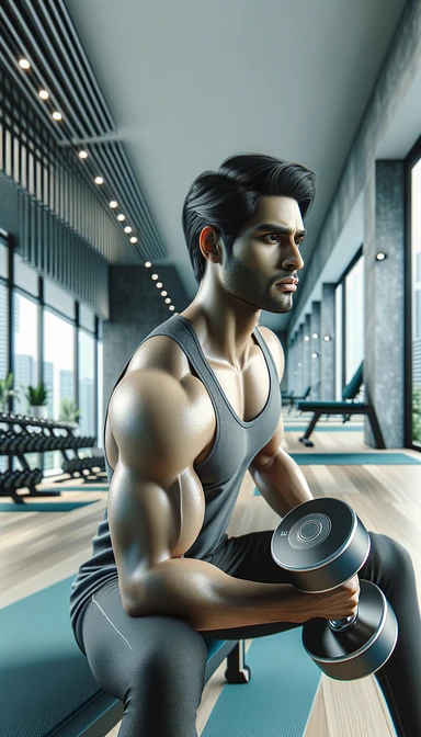 uomo italiano fitness in una palestra che fa un esercizio con manubri da palestra in mano, sfondo chiaro e minimal sfocato della palestra moderna, iperrealistica 4k emoji