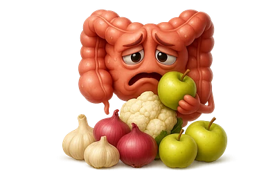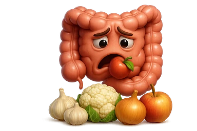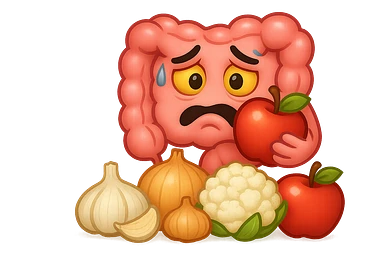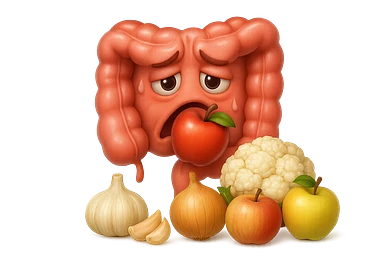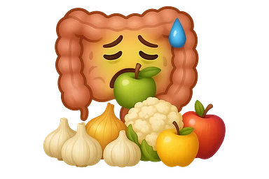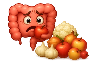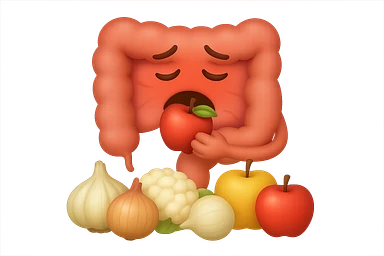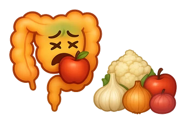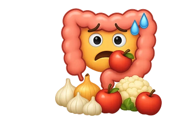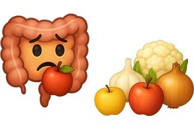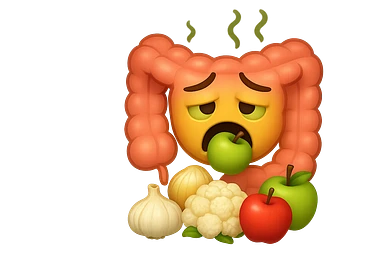 EMOJI STILE IPHONE DI UN INTESTINO UMANO IN CRISI PERCHé STA MALE, IN BOCCA HA UNA MELA E DAVANTI A LUI C'è UNA MONTAGNA DI aglio, cipolle, cavolfiore e mele emoji