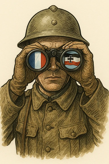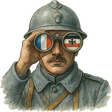 Военный времен Первой мировой смотрит прямо на зрителя в бинокль в одной линзе отражается французский флаг, в другой флаг Германской империи, слегка рисованный, но при этом объемный стиль, прозрачный фон emoji
