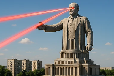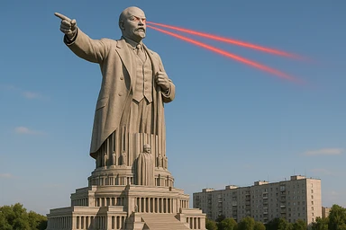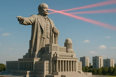 Дворец Советов, основной упор на 100-метровую фигуру Ленина, у которой из глаз вылетают 2 луча прожектора красного цвета. На фоне можно поставить обычные пятиэтажки-панельки, которые в 20 раз меньше Дворца Советов Стиль фото реализм, обычный солнечный день emoji