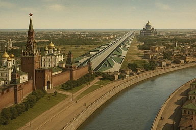 Москва соединена с Санкт-Петербургом и образовывает единый город-луч. Чем-то похожий на NEOM. Перед нами Кремль, а на другом конце линии (в далеке) - Исакиевский собор Архивные цветные фото 1920 год emoji
