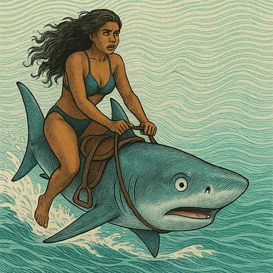 Девушка со слегка темной кожей в купальнике похожая на девушку с купюры седлает удивленную акула, на которой седло и акула удивленно смотрит на зрителя emoji