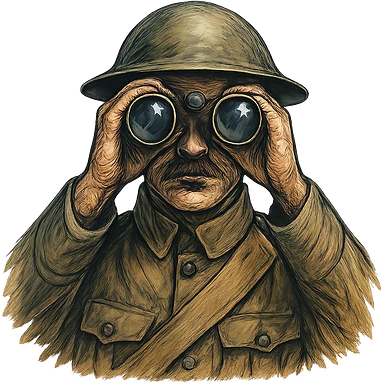 Военный времен Первой мировой смотрит прямо на зрителя в бинокль, слегка рисованный, но при этом объемный стиль, прозрачный фон emoji