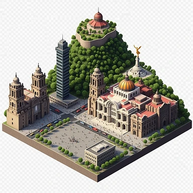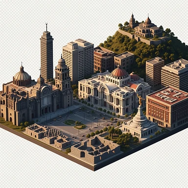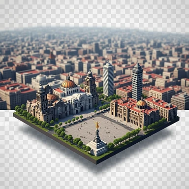 Isometric diorama of Mexico City iconic landmarks: Zócalo square with Metropolitan Cathedral, Palacio de Bellas Artes, Torre Latinoamericana, Chapultepec Castle, and Angel of Independence, atmosphere of the city 3D miniature effect and Tilt Shift effect, no cartoonish look, transparent background. emoji