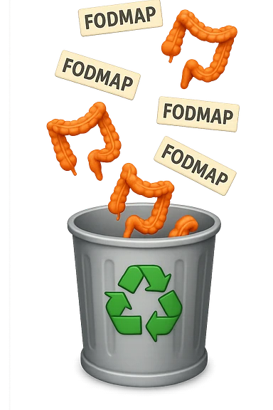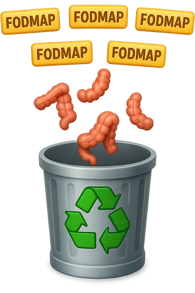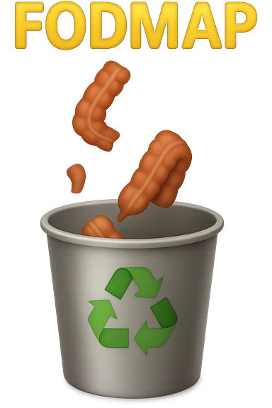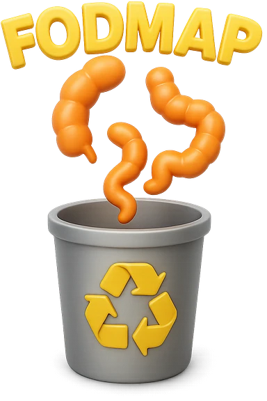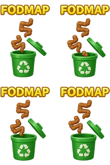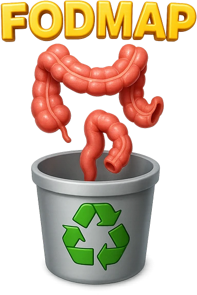 scritte "FODMAP" e pezzi di colon cadono in un secchio della spazzura con simbolo "recycle" sopra, stile emoji iphone, iperrealistico 4k emoji