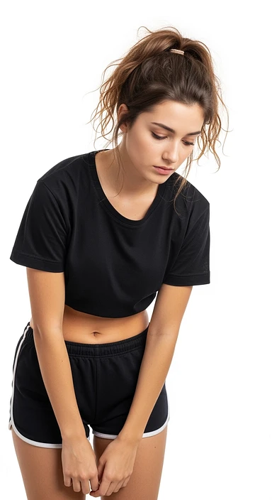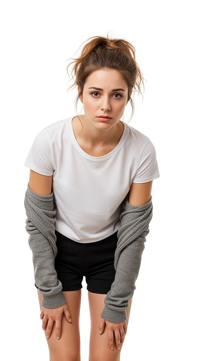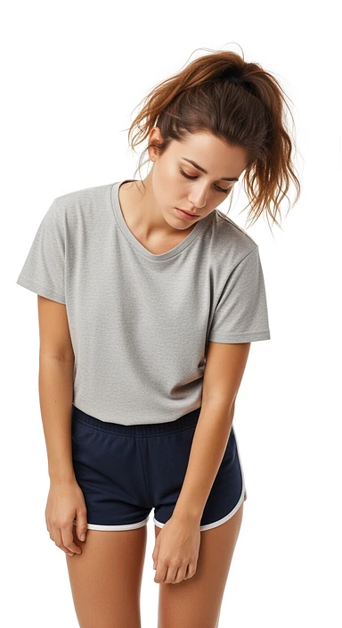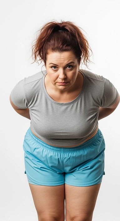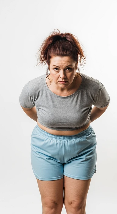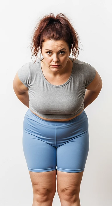 donna con cellulite in gym short leggermente piegata in avanti, con espressione dispiaciuta in volto isolata su sfondo bianco emoji