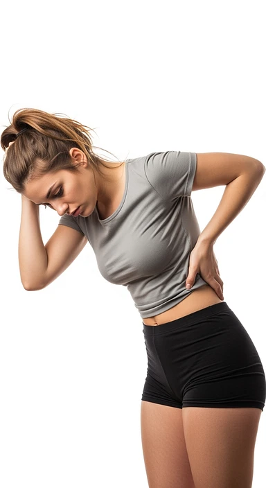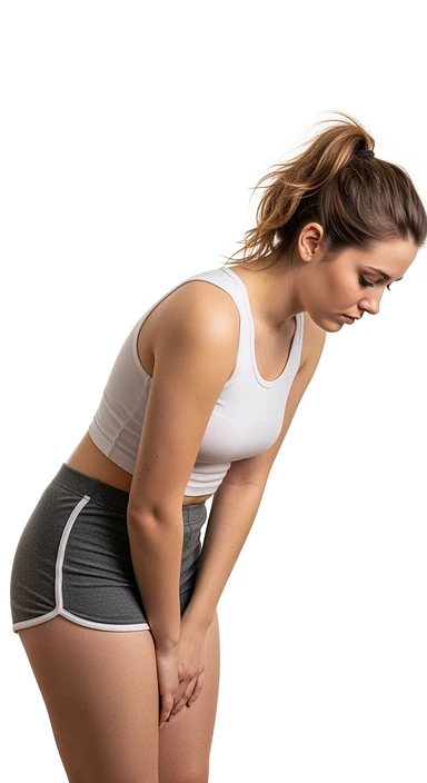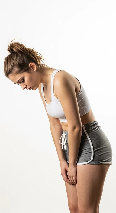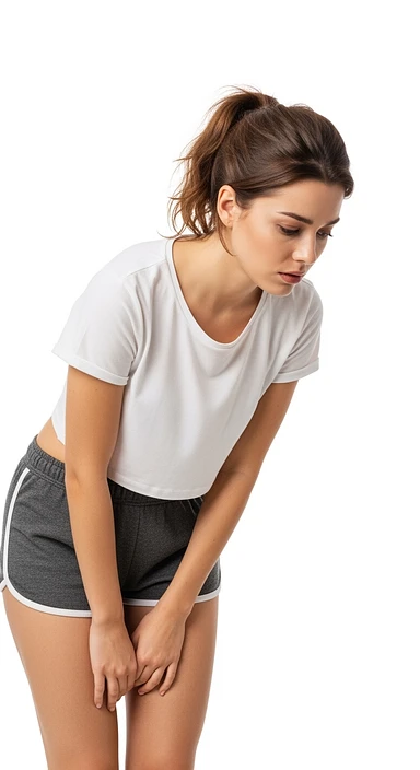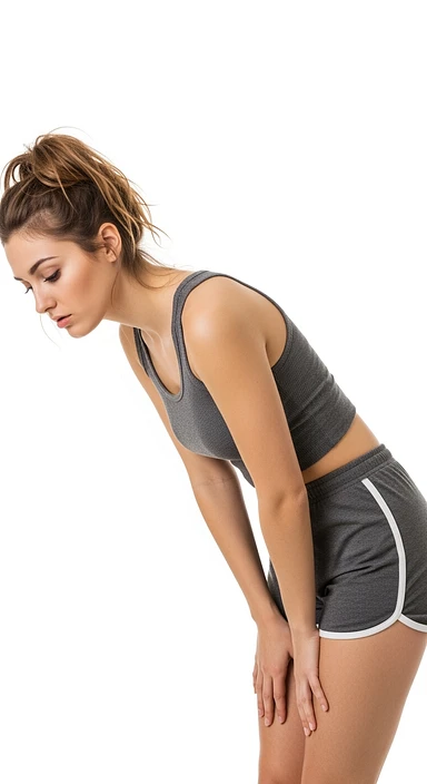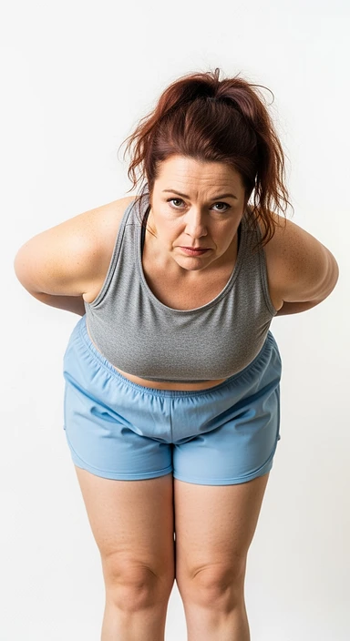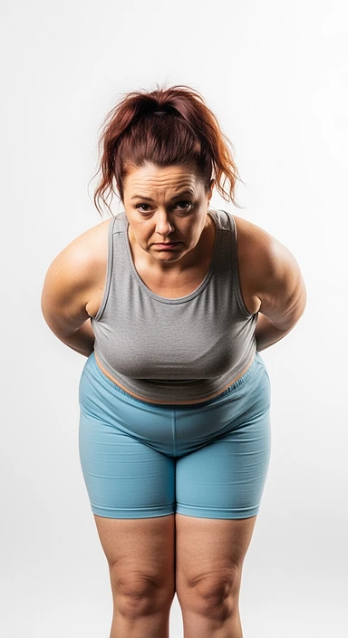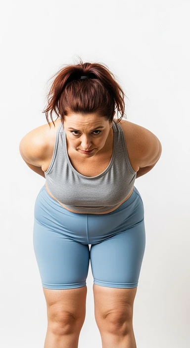 donna fitness con cellulite leggermente piegata in avanti, isolata su sfondo bianco emoji
