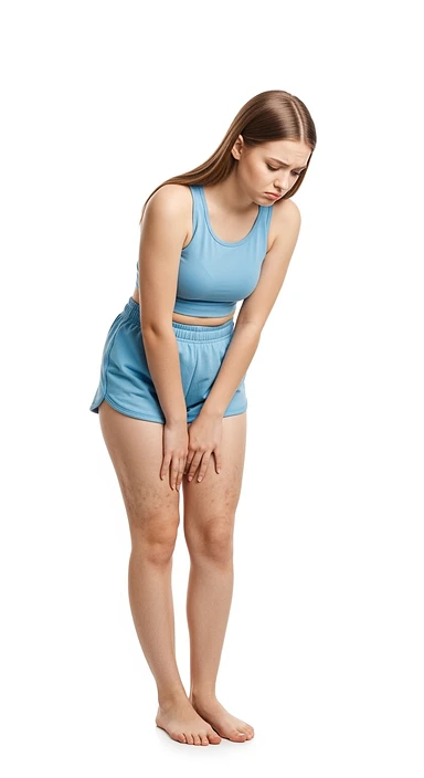 donna giovane con cellulite buchi di cellulite e ritenzione in gym short leggermente piegata in avanti, con espressione dispiaciuta in volto isolata su sfondo bianco emoji