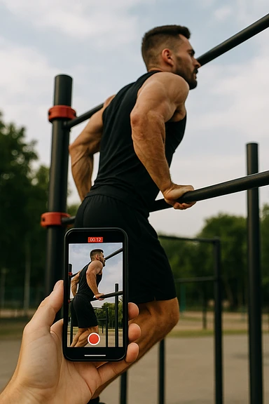 uomo che fa Muscle up e si sta filmando di lato con il telefonino che lo riprende mentre si allena, così da analizzarsi dopo emoji