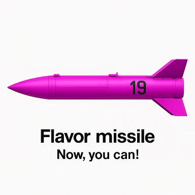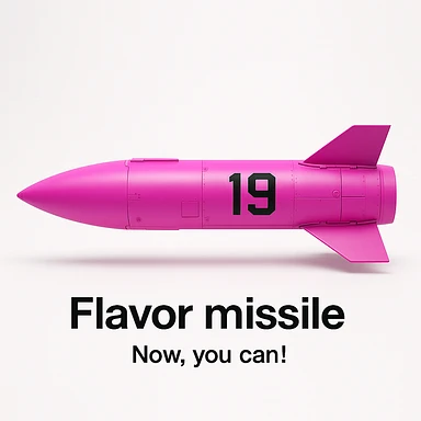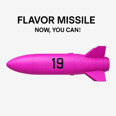 a product image - white background - a orthographic side view of a sleek, minimalist futuristic sidewinder missile pod which is colored 255-0-255 pink, with a black number "19" emblazoned on the sign. The product image reads "Flavor missile - Now, you can!" emoji