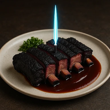 a delicious plate of smoked ribs, the color of the meat is succulent dark blackish purple, the 5 Michelin star dish is plated with a tiny energy sword piercing the center emoji